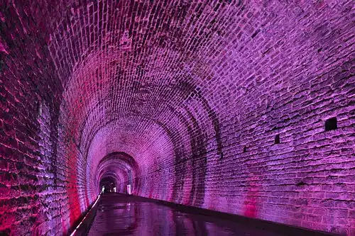 The Brockville Railway Tunnel, also called the Brockville Tunnel, is a former railway tunnel located beneath the downtown of Brockville, Ontario, Canada. It is the first railway tunnel built in Canada; construction began in September 1854 and the first train passed through the tunnel on December 31, 1860. Since 2017 it has been opened to the public as a free seasonal tourist attraction.