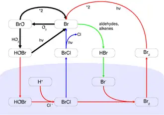 During springtime in the polar regions of Earth, unique photochemistry converts inert halide salt ions (e.g. Br−) into reactive halogen species (e.g. Br atoms and BrO) that episodically deplete ozone in the atmospheric boundary layer to near zero levels.[6] These processes are favored by light and low temperature conditions.[4] Since their discovery in the late 1980s, research on these ozone depletion events has shown the central role of bromine photochemistry. The exact sources and mechanisms that release bromine are still not fully understood, but the combination of concentrated sea salt in a condensed phase substrate appears to be a pre-requisite.[7] Shallow boundary layers are also likely to be beneficial since they enhance the speed of autocatalytic bromine release by confining the released bromine to a smaller space.[3] Under these conditions, and with sufficient acidity, gaseous hypobromous acid (HOBr) can react with condensed sea salt bromide and produce bromine that is then released to the atmosphere. Subsequent photolysis of this bromine generates bromine radicals that can react with and destroy ozone.[7] Due to the autocatalytic nature of the reaction mechanism, it has been called bromine explosion.