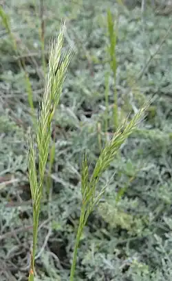 It is an annual grass growing 30 to 70 centimetres (12 to 28 in) tall with an open, branching inflorescence in the form of a panicle. The primary branches of the panicle are appressed. Its spikelets are solitary, and fertile spikelets have pedicels. The spikelets are flat and hairy, with five to eight florets; the spikelets break up at maturity and disarticulate below the fertile florets. The glumes are shorter than the spikelets and thinner than fertile lemmas. Both upper and lower glumes are lanceolate, and both are hairless or only have very fine hairs. The lemmas are 9 to 14 mm (3⁄8 to 1⁄2 in) long and have seven prominent veins. The awns are 6 to 13 mm (1⁄4 to 1⁄2 in).[3] Its anthers are about 0.4 mm (1⁄32 in) long, which suggests that most of its seeds are produced by self-fertilization.[4]