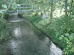 The source of the Bronnbach is a strong Karst spring. Its spring box is located completely in the municipal waterworks. On average, the karst spring discharges about 450 litres of water per second (max. 1180 L/s); its catchment area covers about 90 to 100 km². The part of the spring water that is not fed into the drinking water supply flows through a drain pipe into the original course of the Bronnbach stream. After a good 400 m , this stream flows into the Neckar in the left Neckar floodplain at the Bronnmühle. The Bronnbachspring now supplies the city centre, the districts of Seebronn and Hailfingen as well as Weiler and Bad Niedernau south of the Neckar [1]