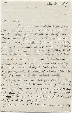 The Brontë sisters were highly amused by the behaviour of the curates they met. Arthur Bell Nicholls (1818–1906) had been curate of Haworth for seven and a half years, when contrary to all expectations, and to the fury of Patrick Brontë (their father), he proposed to Charlotte. Although impressed by his dignity and deep voice, as well as by his near complete emotional collapse when she rejected him, she found him rigid, conventional and rather narrow-minded "like all the curates"—as she wrote to Ellen Nussey.[106] After she declined his proposal, Nicholls, pursued by the anger of Patrick Brontë, left his functions for several months.[107] However, little by little her feelings evolved and after slowly convincing her father, she finally married Nicholls on 29 June 1854.[108]