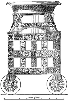 In the late 19th century, bronze chariots were discovered in Cyprus which had a remarkable similarity to the biblical description of the bases of the lavers.[14] This has provided some clarification of the nature of misgeroth/sygleiston, and shelabbim/hexechomena, as well as explaining the design of the mouths of the lavers themselves (see illustration of the reconstruction, above).[3]