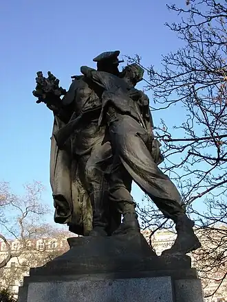Brotherhood (Czech: Sbratření, lit. 'Fraternation') is a sculpture by the Czech sculptor Karel Pokorný (1891-1962). Initially placed in Česká Třebová, Czechoslovakia in 1951, it was dedicated to the end of the Prague Offensive during World War II.[1] Its replicas were established in Prague (1960, replaced in 1988[1]), Saint Petersburg (1977) and Kurpaty, Crimea (1985). The sculpture depicts the meeting of a Soviet Red Army soldier and a Czech militiaman in May 1945. Soviet art critics evaluated Brotherhood as one of the best works of socialist realism.[2] This sculpture became a symbol of friendship between the peoples of the Soviet Union and Czechoslovakia.[3] Its image was used on stamps, coins, banknotes, etc.