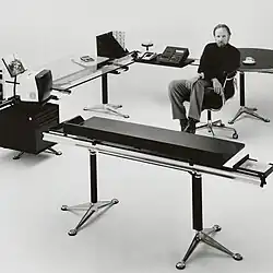 In that same year, Burdick designed the Burdick Group desk for Herman Miller.[11] Supported by aluminum beams and pedestals, the components can be rearranged to put tools and resources within easy reach. As Burdick put it, "What I wanted was a desk that was responsive to the way an individual works . . . a desk that a designer could specify for 20 different people, with each one being different."[12]Time magazine reporter Wolf van Eckardt pronounced it one of the five best industrial designs of 1981.[13] It was Gordon Gekko's desk in the 1987 film Wall Street.[14]