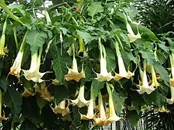 Every part of Brugmansia suaveolens is poisonous, with the seeds and leaves being especially dangerous.[16] As in other species of Brugmansia, B. suaveolens is rich in scopolamine (hyoscine), hyoscyamine, atropine, and several other tropane alkaloids.[17] Effects of ingestion can include paralysis of smooth muscles, confusion, delusions, tachycardia, dry mouth, constipation, visual and auditory hallucinations, mydriasis, rapid onset cycloplegia, and death.[18][19][20]