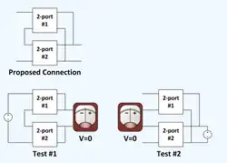 To check if two two-port networks can be connected in a parallel-parallel configuration, first of all just the input ports are connected in parallel, a voltage is applied to the input and the open-circuit voltage is measured/calculated between the outputs that are short-circuited each. If there is a voltage drop, the two-port networks cannot be combined in parallel. The same test is repeated from the output side of the two-port networks (parallel connection of the output ports, application of a voltage to the output, measurement/calculation of the open-circuit voltage between the inputs that are short-circuited each). Only if there is no voltage drop in both cases, a combination of the two-ports networks is permissible.