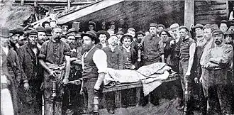 Rescuers entering the mine after the explosion found themselves suffocating on the afterdamp gas and had to return to the surface, often unconscious, carried by other rescuers;[5] however, the determination was such to find the bodies, and to find any survivors, that the rescuers – mostly miners from nearby mines – would insist on returning to the airless mine as soon as they had been revived on the surface.[6] Miners came from as far as Denniston to assist the rescue effort, though it took the Denniston miners several days to arrive as they had to travel by sea from Westport. Wood explains this: "The response of the West Coast miners in volunteering for the rescue parties was due to their occupational loyalties and social and kinship ties. Occupational bonding, especially of coal miners, requires obedience to the miner's code that they come to each other's assistance. Denniston miners and mine managers, like Blackball miners, included former workmates, relatives and friends belonging to the same generation of immigrants, particularly those arriving between 1875 and 1885".[5] According to Wood: "The tragedy helped to break down some old world differences and establish a West Coast identity, especially in the mining community.[5]