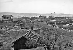 Brynmawr station was located to the south of the main town centre on an east–west embankment.[14] It has been described as "having something of a Wild West air" due to its lofty location on the edge of town and the wooden buildings which could be very draughty given that Brynmawr is nearly 1,200 feet (370 m) above sea level.[15][16] To the north of the station was St Mary's Roman Catholic Chapel and School, while to the west was the Holy Trinity Church.[17] Beyond St Mary's was a mineral line known as Bailey's Tramroad built by Crawshay Bailey in c. 1869 which ran from his ironworks at Nantyglo through Brynmawr to join the L&NWR's Abergavenny line.[12] The station, which had its entrance on the southside,[18] had seven platforms were provided which were a mixture of stone-faced and timber construction.[19] Platform 4 was a bay for Nantyglo which opened in 1906 and was perched on the edge of the embankment.[20] In 1955, 22 trains ran each way between Brynmawr and Newport via Nantyglo, with one train each way running between Brynmawr and Abercarn.[21] The auto-trains for Blaenavon used platform 3.[22] A glass-panelled footbridge linked the platforms.[23] To the south of the station there were extensive sidings and a turntable suitable for coal tanks.[24]