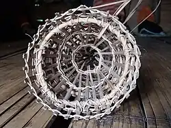 It is traditionally and most commonly made from various types of soft thin wood such as rattan, bamboo, and palm leaf midrib. However, some modern variants are made using metal wires, usually repurposed from old wire fences.[4] However, metal traps are prone to corrosion which may lead to pollution and cause fish to avoid the trap, compared to materials such as wood.[8]