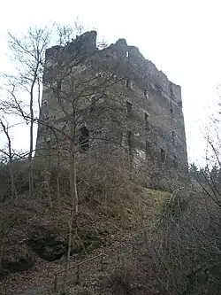 - Balduinseck castle ruin (monumental zone) – built beginning in 1325 by Archbishop Baldwin of Luxembourg, finished about 1332, by 1780 in disrepair, parts of the courtyard wall renovated in 1966; castle courtyard with mighty residential tower, bailey with partial moat