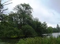 The island is uninhabited and tree-covered. It lies low, acting as a water-meadow in times of flood, opposite houses with large river frontages. Its shape shows the cumulative effect of the locally curved stream, its erosion and deposition make the upstream end almost joined to the bank; the downstream end, broken into islets.