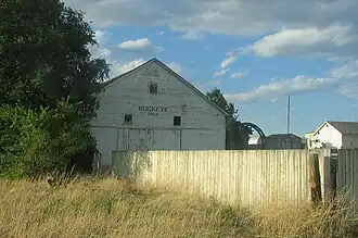 The tallest structure in the area is a grain silo on County Road 78. Extensive feed yards are visible behind the silo which have historically been used for the custom feeding of sheep.