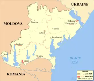 After July 2020, the area is split between Bilhorod-Dnistrovskyi, Bolhrad, and Izmail raions.