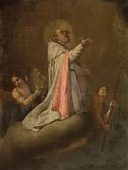 A year later, he was sworn in as court painter at the Royal Palace of La Granja de San Ildefonso. He established himself inn Zaragoza, where he was named Director of Painting at the Real Academia de Nobles y Bellas Artes de San Luis, a position he held until his death. During his final years, he was best known for an Annunciation at the church of Santa María la Mayor in Alcañiz,[3] and three portraits: Archbishop Agustín de Lezo y Palomeque, the merchant Juan Martín de Goicoechea (1732-1806), a close friend of Goya, and the Bishop of Valladolid, Juan Antonio Hernández Pérez de Larrea, who was also a botanist and a member of the Sociedad Económica Aragonesa.[4]