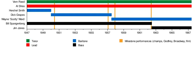 | Past members | Vern Reed (1947–67) Al Shea (1947–67) Herschel Smith (1947–50) Dick Grapes (1950–57) Wayne "Scotty" Ward (1957–67) Bill Spangenberg (1947–62) Jim Jones (1962–67) |