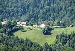 Bukovec is the site of three known mass graves associated with the Second World War. The Mačkovec Mass Grave (Slovene: Grobišče Mačkovec) is located in the woods southeast of the settlement. Its location is marked by crosses cut into the trunks of two trees. It contained the remains of about 40 prisoners of war, mostly members of the Anti-Communist Volunteer Militia, that were taken from the prison in Ribnica and murdered at the site on 27 or 28 October 1943 by the Partisan Loka Brigade.[6][7][8] In October 2013 the remains were disinterred and reburied at the cemetery in Begunje pri Cerknici.[9][10] The Italian Soldiers Mass Grave (Grobišče italijanskih vojakov) is located in the woods south of Bukovec, below the north slope of Mačkovec Hill. It contains the remains of Italian soldiers.[8][11] The Romani Mass Grave (Grobišče Romov) is located in the woods south of Bukovec near the Janez Klančar Grave in the territory of neighboring Selo pri Robu, which is marked with a cross. It contains the remains of Romani murdered at the site[8][12] by a Partisan group led by Stane Semič.[13]