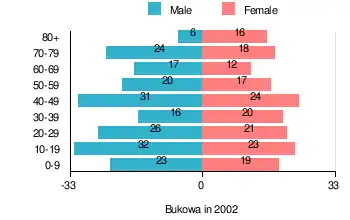 According to the 2002 Poland census, there were 365 people residing in Bukowa village, of whom 53.4% were male and 46.6% were female. In the village, the population was spread out, with 24.9% under the age of 18, 31.2% from 18 to 44, 20.3% from 45 to 64, and 23.6% who were 65 years of age or older.[2]