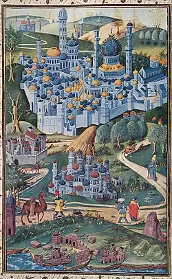 In 1455 Philip the Good Duke of Burgundy ordered his secretary, Jean Miélot, canon of Lille and miniaturist to translate the Descriptio Terrae Sanctae, by Burchard of Mount Sion (1283). The translation was embellished by him with beautiful miniatures of Jerusalem copies of which are held in Bibliothèque nationale de France, Royal Library of Belgium and the Bodleian Library, Oxford.[9] For Burchard's Jerusalem, the map of Jerusalem by Marino Sanudo in his Liber Secretorum Fidelium Crucis.[10] An English translation of the original longer manuscript is provided in Denys Pringle's collection of translated pilgrimage texts part of the Crusade Texts in Translation series published by Ashgate.[11]