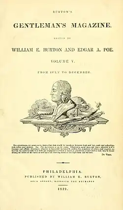 The magazine's most famous contributor and one-time editor was Edgar Allan Poe. Poe approached Burton to offer his services in May 1839.[3] The June issue of that year included the notice that its owner had "made arrangements with Edgar A. Poe, Esq., late Editor of the Southern Literary Messenger, to devote his abilities and experience to a portion of the Editorial duties of the Gentlemen's Magazine". Poe agreed to provide about 11 pages of original material per month and his name was added next to Burton's.[4] His role included editing articles and proofreading as well as original contributions like critical reviews.[2] Burton offered Poe $10 a week for his services and estimated he would need to dedicate only two hours a day.[5] In Burton's, Poe published now several of his own original tales including "The Man That Was Used Up" (August 1839), "The Fall of the House of Usher" (September 1839), "William Wilson" (October 1839), "Morella" (November 1839), "The Conversation of Eiros and Charmion" (December 1839) and "The Business Man" (February 1840).[2] Disagreements between the two caused Burton to fire Poe in June 1840.