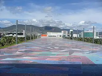 Gálvez also created murals and sculptures, both small and monumental. His first mural was sculpted done in 1968 in Los Angeles.[2] However, most of his monumental work was produced later in his career as he concentrated on painting in the 1970s and 1980s.[4][13] These include a mural at the National Conservatory of Music in Mexico City (1970), a thirty-foot high sculpture in Unidad Morelos in Mexico City (1971), a hand hammered copper triptych for a private residence in Mexico City (1984), a sculpted door for a private residence (1985), a sculpture for a private home in New York (1986), Reclined Torso at the Hotel Nikko Mexico (1998), Torso I a five-foot high sculpture for the city of Pachuca (1999), Torso II a nineteen foot high sculpture at the Altiva Building, Mexico City (1999), Millennium, a bronze sculpture/fountain at the highway entrance to Pachuca (2000), a sculpture garden for Mixquiahuala, Hidalgo (2005) and the master plan and central mosaic for the David Ben Gurion Cultural Park in Pachuca (2005) .[3][4][9] The park project, the last before his death, included not only the creation of the central mosaic, the largest pedestrian mural in the world at 345,000ft2, but also the design of the 65-acre park itself.[13]