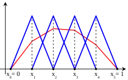 of the interval and let be the space of all continuous functions that are affine on each subinterval in the partition (such functions are called piecewise-linear). In addition, assume that any function in takes the value 0 at the endpoints of It follows that is a vector subspace of whose dimension is (the number of points in the partition that are not endpoints).