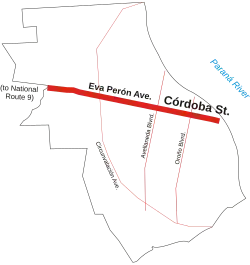 Córdoba Street is one of the most important streets in Rosario, Santa Fe Province, Argentina. It runs east–west through the center of the city, from the coastal avenue by the Paraná River to the western limit of the urbanized area.