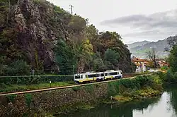 ![]() A Renfe 3500 Series train on C-5 line going through the Nalón basin area. | |