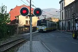 ![]() A Renfe 3300 Series train on C-6 line passing through a level crossing in L'Infiestu. | |