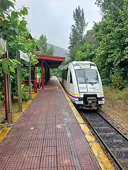In the latter half of the 20th century, railway freight transport lost its economic significance, and Ferrocarril de El Vasco accumulated a considerable amount of debts.[5] Consequently, in 1972, the ownership of this line was transferred to FEVE, a government-owned company established with the objective of operating all narrow-gauge railway lines within Spain.[6][7] From that point freight transport was discontinued and this line was exclusively used for passenger transport.[8] The lack of investment in its infrastructure, the opening of new road sections branching from the A-66 highway leading to Oviedo and the closure of the Fuso de la Reina branch to Oviedo due to an urbanistic project called the Green Belt caused that its number of passengers dwindled every year until the service from Baiña to Trubia was discontinued in 2009, thus disconnecting the two lines that used to run on the old Ferrocarril del Vasco line.[9] Following the integration of Feve into Renfe Feve in 2012 (renamed as Renfe Cercanías AM in 2021), this lack of investment was aggravated and infrastructure deteriorated a bridge presented unfixable structural damage and daily commuting has been repeatedly interrupted due to the poor conditions of the rolling stock.[10][11][12][9] Consequently, the number of passengers dropped once again.[13] The security system ASFA, installed in 2021, is not well adjusted to the characteristics narrow-gauge lines, thus train services are slower than decades ago.[14]