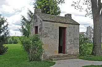 The C.D. and Eliza Heath Bevington Privy is a historic building located in Winterset, Iowa, United States. Bevington was a pharmacist who passed through the area in 1849 on his way to the California Gold Rush. He settled in Winterset in 1853 after he made his fortune, and worked as a real estate agent, farmer, livestock dealer, and banker.[2][3] The 7.5-by-10.33-foot (2.29 by 3.15 m) structure is composed of roughly squared quarry faced rubble that is laid in a two against one bond. There is a stone vault with a depth of 6 feet (1.8 m) beneath the entire structure. The privy served the C.D. Bevington House. It was listed on the National Register of Historic Places in 1987.[1] It is now part of a museum complex operated by the Madison County Historical Society.