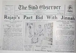 Chakravarti Rajagopalachari (or Rajaji as he was commonly referred to) was a prominent Congress leader from Madras. He was a well known follower of Gandhi and was sometimes referred to as Gandhi's conscience keeper.[23] Nonetheless, he proposed that if Muslims in India wanted a partition, Congress should not oppose this.[24] Thus he was the earliest Congress leader to acknowledge that partition was inevitable. He considered that, in the then likely scenario of Japanese invasion, India would need the support of the British and hence required the Congress and the League to agree on the constitution of India with urgency.[10] In April 1942, parts of the Madras Presidency were bombed by Japanese warplanes operating from the aircraft carrier Ryūjō. Arthur Hope, the Governor of Madras advised the people to leave Madras and also moved the secretariat inland.[25] Rajaji considered this an act of the British administration forsaking the people of Madras and brought resolutions in Madras Legislature Party of the All India Congress Committee that the Congress should concede the demand of Pakistan if the League insisted on it.[26] With severe opposition to the resolutions from the Congress leadership, he resigned from the Congress as per Gandhi's advice.[27] Thus he did not participate in the Quit India movement and was not arrested with the other Congress leaders.[24] Hence he was able to devise a proposal to negotiate with the League.[28] This proposal, which was called the CR formula by the popular press[29] was to recognise the demand for Pakistan in principle and to act as a basis for talks between the League and the Congress.[30]