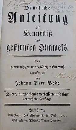His early promise in mathematics brought him to the attention of Johann Georg Büsch, who allowed Bode to use his own library for study. He began his career with the publication of a short work on the solar eclipse of 5 August 1766. This was followed by an elementary treatise on astronomy entitled Anleitung zur Kenntniss des gestirnten Himmels (1768, 10th ed. 1844), the success of which led to his being invited to Berlin by Johann Heinrich Lambert[2] in 1772 for the purpose of computing ephemerides on an improved plan. There he founded, in 1774, the well-known Astronomisches Jahrbuch, 51 yearly volumes of which he compiled and issued.[3]