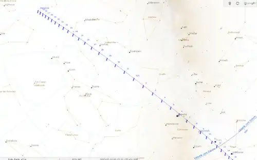 The comet's closest approach to Earth was on 1 February 2023, at a distance of 0.28 AU (42 million km; 26 million mi). As of 31 January 2023, the comet had an apparent magnitude of about 5; its coma was reported to be about 20' across.[12] The central region of the coma measured bout 4 arcminutes across, which corresponds to diameter of 50,000 km, and featured two jets about 20 arcseconds long.[17] During its closest approach to Earth, it was near the north celestial pole[33] and located within the Camelopardalis constellation.[34] The moon was a waxing gibbous and the brightening moon hampered viewing the comet without optical aid.[35] On 5 February, at the full moon, the comet passed 1.5 degrees from the bright star Capella.[35] On 6 February, C/2022 E3 (ZTF) visually passed near comet C/2022 U2 (ATLAS).[36] On 10 to 11 February, the comet passed 1.5 degrees from Mars and, on 13 to 15 February, passed in front of the Hyades star cluster.[22]