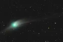 The green color is likely due to the presence of diatomic carbon, chiefly around the comet's head.[40][41] The C2 molecule, when excited by the solar ultraviolet radiation, emits mostly in infrared, but its triplet state radiates at 518 nm (nanometers). It is produced by photolysis of organic materials evaporated from the nucleus. It then undergoes further photolysis, with a lifetime of about two days, at which time the green glow appears in the comet's head but not the tail.[42][43] The comet researcher Matthew Knight opined that the green color of this comet is not unusual for comets with a higher gas content, but they only rarely approach the Earth as close so it provides for very good observation of the greenish hue.[44] Similar colors were seen with observations of comet C/2021 A1 (Leonard).[45]