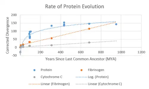The rate of evolution of C10orf67 is very curious in that it follows a logarithmic trend rather than a linear trend, like most proteins.