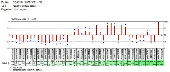 C11orf52 is highly expressed in the thyroid, thalamus, pituitary, placenta, and prostate, kidney, heart, and skeletal muscles.[7] However, in estrogen receptor alpha-silenced MCF-7 breast cancer cells, it is expressed at an extremely low level compared to control tissues.[8]