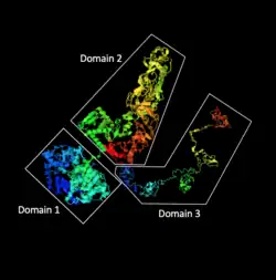 The 3D structure of C2orf16 is predicted to have three major domains. Domain 1 is from amino acids 1 to 662, domain 2 is from amino acids 674 to 1,487, and domain 3 is from amino acids 1,488 to 1,984.[27] Domain 1 and 2 are predicted to be connected via a stretch of 12 amino acids not otherwise organized into a secondary structure allowing flexibility between domains 1 and 2. Domain 2 is predicted to have protein interacting domains for transcription factors.[27] Domain 3 is predicted to follow a "balls on a string" structure[27] and has many sites for possible phosphorylation.[28]