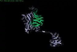 Several programs suggest that the secondary structure of the protein is mainly helices with only a few beta sheets.[12][13][14][15] Analysis of protein composition also suggests that the protein has relatively low levels of glycine.[16] This could suggest a fairly rigid structure relative to other proteins. The tertiary structure is harder to predict due to the size of the protein, partially due to its size. The 3-D structure shown shows a prediction made by I-TASSER. This is a possible structure with a C-score of -1.06 on a scale from -5 to 1 (in which the higher the number the greater the confidence).[17][18][19] This predicted structure indicates there are two main parts, and it is possible they interact depending on the state of the protein (e.g. whether or not it's phosphorylated).