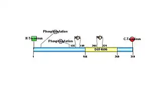 The protein C8orf48 is 319 amino acids in length.[15] The molecular weight of this protein is 36.9 kDa and the isoelectric point is 8.86.[16] The C8orf48 protein is predicted to be a nuclear protein particularly located in the nuclear lamina.[6] This protein does not possess any signal peptides or transmembrane domains. This protein has also been found to be fairly abundant in humans.[17]