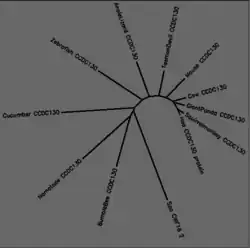 CCDC130 is a highly conserved protein, with true orthologs present in primates, other mammals, amphibians, reptiles, fish, and even invertebrates, such as insects and marine invertebrates. Bird orthologs have not been found in nucleotide or protein BLASTs [6] There have been homologous genes documented in yeasts and other fungi, as well as plants. It is unclear when the most distant homolog of CCDC130 arose, but it was well before the divergence of autotrophs and heterotrophs