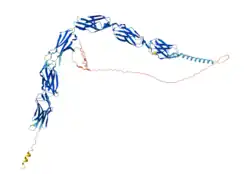 PECAM-1 is a highly glycosylated protein with a mass of approximately 130 kDa.[9] The structure of this protein was determined by molecular cloning in 1990, when it was found out that PECAM-1 has an N-terminal domain with 574 amino acids, a transmembrane domain with 19 amino acids and a C-terminal cytoplasmic domain with 118 amino acids. The N-terminal domain consists of six extracellular Ig-like domains.[10]