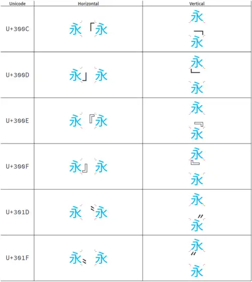 Quotation marks and other punctuation have expected differences in behaviour in vertical and horizontal text. The quotation marks 「...」, 『...』 and 〝...〟 rotate 90 degrees, as follows:
