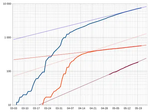 - On 12 March, five new cases of COVID-19 were recorded, as well as the first death from the disease.[27] A second death was recorded shortly after.[28][29] The ministry of Health, Population and Hospital Reform began reporting recoveries, stating that eight patients had recovered.[30] On the same day, schools were locked due to the coronavirus spread,[31] and all cultural events were postponed.[32]