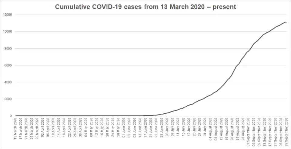 September started off with 7,692 cases of COVID-19. Although cases were still increasing exponentially, a slight decrease was observed in the preceding week. On 2 September, Khomas and Erongo regions both had 3,400+ cases.