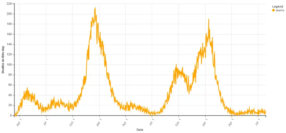 By January 3, 2021, the total number of deaths had increased to 9,076.[69] By January 6, the number of total hospitalizations had increased to 40,104.[70] By January 7, 753,068 total cases had been reported.[71] By January 14, 807,293 cases had been reported, leading to 9,990 deaths.[72] By January 15, the total number of deaths surpassed 10,000.[73] The number of deaths surpassed 11,000 on January 28.[74]