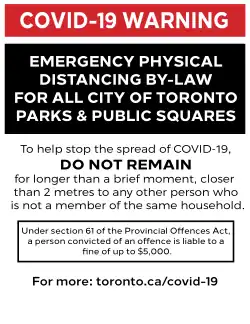 On Saturday, May 23, 2020, due to warmer weather, estimates of up to 10,000 mostly young people gathered in Trinity Bellwoods Park.[28] Public outrage ensued as well as condemnation from Premier Ford and Toronto's medical officer of health Eileen de Villa.[29][30] After making a tour of the city's parks and speaking with citizens, Mayor John Tory was criticized for lack of social distancing and improperly wearing a mask.[31] He publicly apologized for his actions to following day.[31] No social distancing fines were placed, however, there were several issued for public urination.[32] Police presence was increased the following day to prevent any subsequent large gatherings.[33] The following week, 'social distancing circles' were painted on the lawn in the park modelled after similar tactics used in San Francisco and New York City.[34][35][36][37][38]