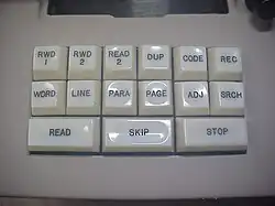The keyboard of the CPT 4200 had action keys for "skip", "read" and "stop", mode keys for "word", "line", "paragraph," and "page." Pressing "read" transferred a word, line, paragraph, or page (depending on which mode key had been selected) from the input tape to both the typewriter and the output tape. Line boundaries (aka printer margins) recorded on the input tape were ignored or retained depending on whether or not the "adjust" key had been selected. Alternatively, pressing "skip" moved past the corresponding amount of text on the input tape without sending it to the typewriter or to the output tape.