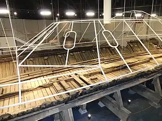 After nearly a century, the remaining lower hull of the ironclad was discovered and then raised in 1963; approximately 15,000 shipboard artifacts were recovered and carefully cataloged. Neuse's hull was then temporarily installed in the Governor Caswell Memorial, beside the river, in Kinston.[2][3] Since 2013, Neuse and her artifacts have been on display in a new, climate-controlled building in downtown Kinston.[4][5][6]