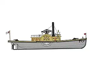 | Propulsion | 1 high pressure steam boiler, side paddle wheels |