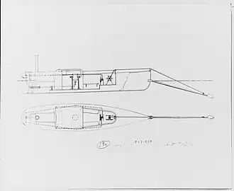 Propulsion was provided by a single screw propeller,[7] which was powered by a two-cylinder condensing marine steam engine and a single boiler.[8][9] Her top speed is not known, but the vessel was reputed to be fast in contemporary reports.[7] Squib's forward hatch and machinery were protected by armor made from boiler iron.[10][9] The vessel's spar torpedo shaft was 18 feet (220 in) long,[10] and could be raised and lowered by a chain and tackle system.[11] Her crew numbered 6.[3]